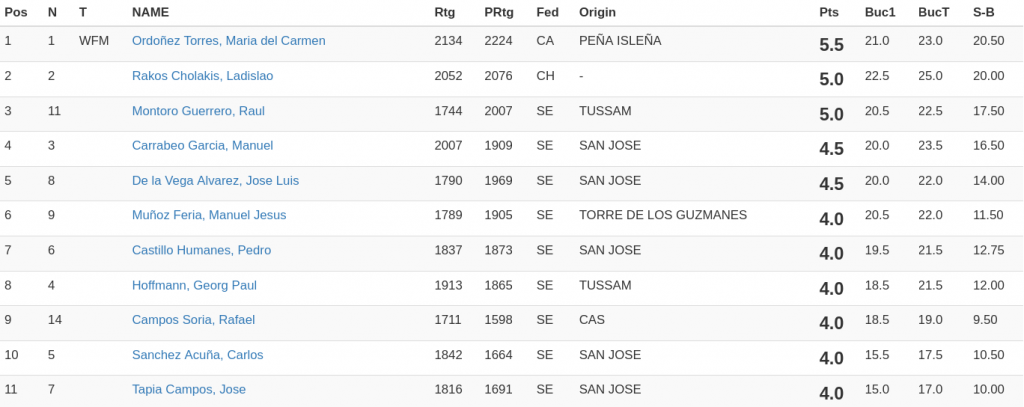 En cuarta posición con 4,5 puntos quedó Manuel Carrabeo, que no pudo estar en el podio final tras perder con Raúl Montoro y Pedro Castillo. Con los mismos puntos un fuerte José Luis de La Vega en quinta posición, que sólo perdió con la campeona y consiguió tablas con el subcampeón.